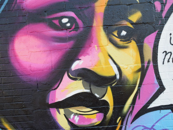 In this mural, Dorothy Bolden stands boldly with the galaxies of space swirling within her, representing divine power and wisdom. On the right, she shakes hands with Governor Jimmy Carter, and on the left, modern-day domestic workers stand beside her. On both sides of her are MARTA buses. Dorothy Bolden built political power and reached other housecleaners, nannies and caregivers on the MARTA buses they took everyday to get to work; she knew the racism they faced on the buses and in their employers’ homes and turned the buses themselves into de facto union meetings, talking to other passengers about their labor rights and what they deserved. From educational reform, transportation justice to labor rights, she cared about all aspects of her community. As scholar Premila Nadasen noted, “these ‘freedom buses’ were comparable to the rural freedom schools…sites for political education, organizing and consciousness-raising.”